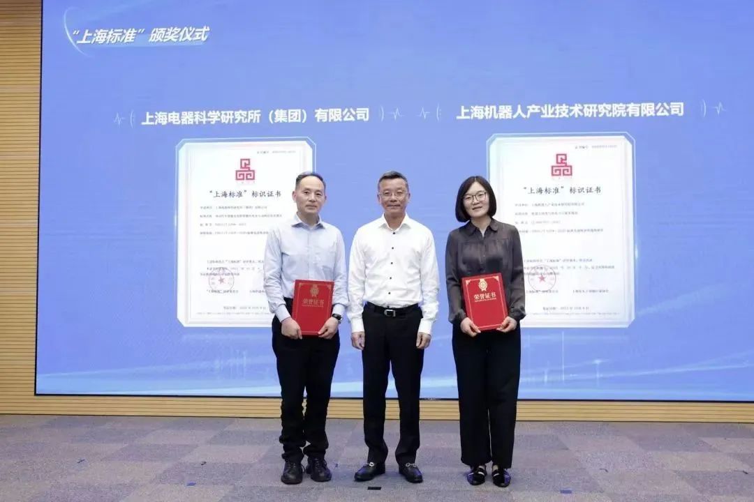 活动现场,肖文高为获得“上海品牌”认证的上海电器科学研究所(集团)有限公司颁奖。陈彦峰为获得“上海标准”评定的上海电器科学研究所(集团)有限公司和leyu.乐鱼(集团)机器人有限公司官网有限公司颁奖。