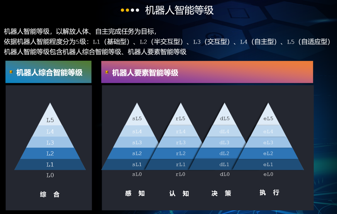 机器人智能等级,以解放人体、自主完成任务为目标,基于感知、认知、决策、执行四大智能要素实现的基础上进行划分,包含机器人综合智能等级、机器人要素智能等级。