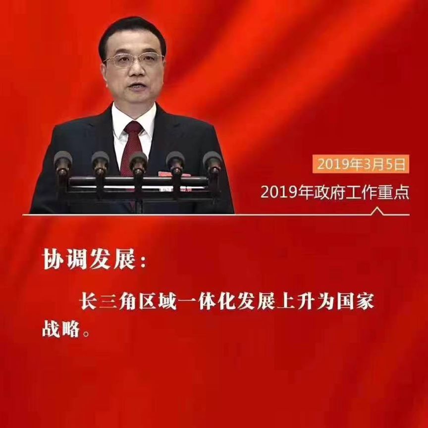 十三届全国人大二次会议于2019年3月5日在北京人民大会堂举行,习近平等国家领导人出席会议。在大会上,国务院总理李克强做政府工作报告时,对2018年工作进行回顾,并同时对2019年政府工作任务作出重要部署:将长三角区域一体化发展上升为国家战略,聚焦促进区域协调发展。